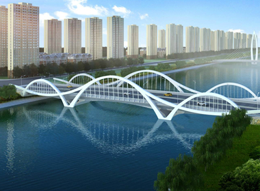 大橋全長約316米,最大單跨80米,施工范圍包括橋梁、道路、排水、給水、交通、電氣等。橋梁建造注重橋梁獨特的景觀功能,以及橋體與沿河景觀規劃的協調。造型從海涂之地汲取靈感,該橋以海浪為主要設計元素,體現新區的地理特點,彰顯濃郁的美麗灣區特色。其栩栩如生的波浪造型,新穎獨特,夜間亮燈后,給人一種浪花朵朵的美麗景象。 2016年4月正式動工,2018年8月1日正式通車。