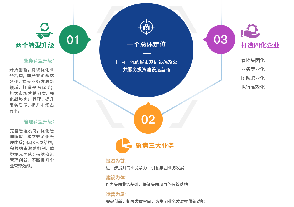 圍繞一個總體定位,實現轉型升級,聚焦三大業務板塊,打造四化企業