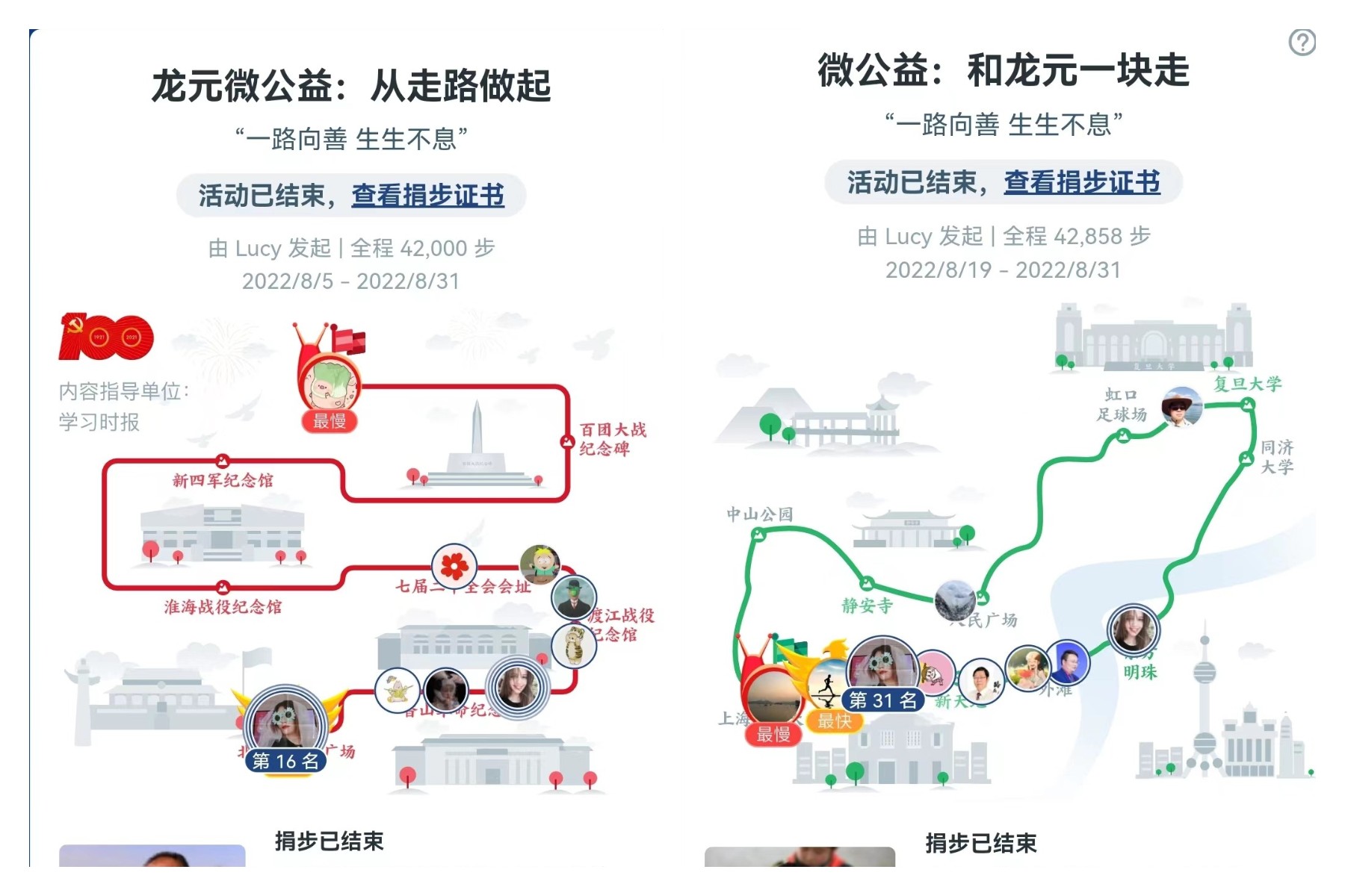 8月5日,集團團委通過“一塊走”小程序發(fā)起“龍元微公益:從走路開始”公益捐步活動,重走紅色文化路線。